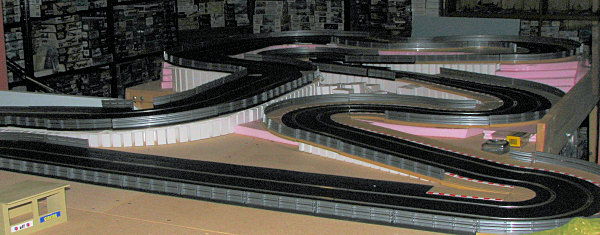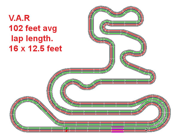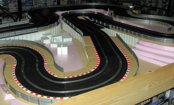You can see that the sections that return to the original hairpin are now made of different shaped turns. I had to add a standard hairpin near the top as nothing else would fit into the space. I now had a track that measured a bit over 100 feet in length. This not only gave me fast and slow bits, but also provided a lap time that didn't have the cars traveling by the driver at the speed of berserker mice!