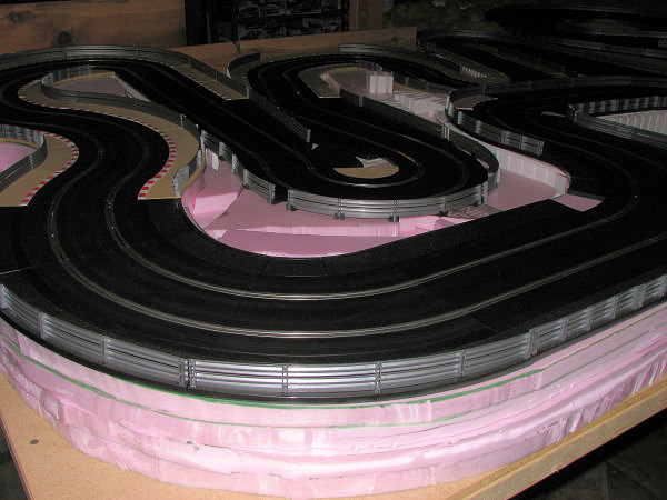 If you recall from the last installment, I'd added an extension to the track and was waiting for some more pieces in order to complete it. I also experimented with stacking some sheets of dense foam board in order to add some elevation to things. I wanted this new extension to be something more than just flat.