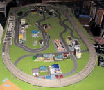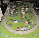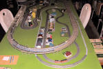 In the meantime, the station set and oval arrived. Much to my surprise, it turned out to be too wide for my 30x80 inch door, so I put a sheet of 4x8 foot plywood over it. It fit, but not by all that much! I then had enough room to use all of my plastic road and even enough to make it two lanes. The tram also had room to sprawl and over the months I added more and more buildings to the layout. I was also fed up with looking at wood so went to a local train shop and bought a 4x8 foot section of 'grass' padding. This is a felt material so, unlike earlier 'grass' mat, there were not bits of fake grass to flake off. Of course, this required everything to be removed, but once that was done and the mat put down, things were placed back on, though this time a bit differently from the first. The nice thing about sectional track is the ability to change things as one wishes.