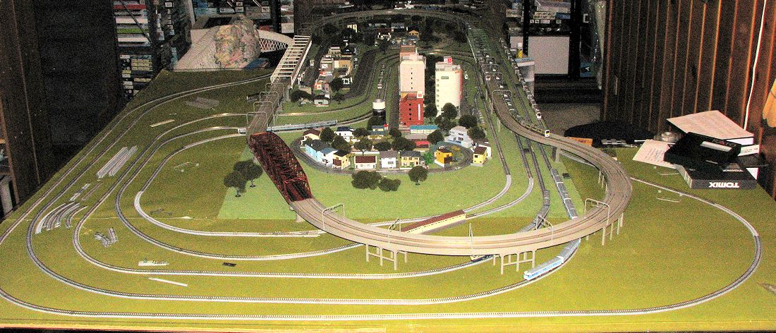 Move forward a few weeks and an order I made for track (about $100 worth) arrives in a big box from Japan. This gives me an opportunity to make some pretty big additions. For the elevated track, I installed another bridge and was able to shuffle around some track to add the curve off to the right as shown in the image below. I had hoped to have it go farther, but will need a few additional pieces to make that happen.