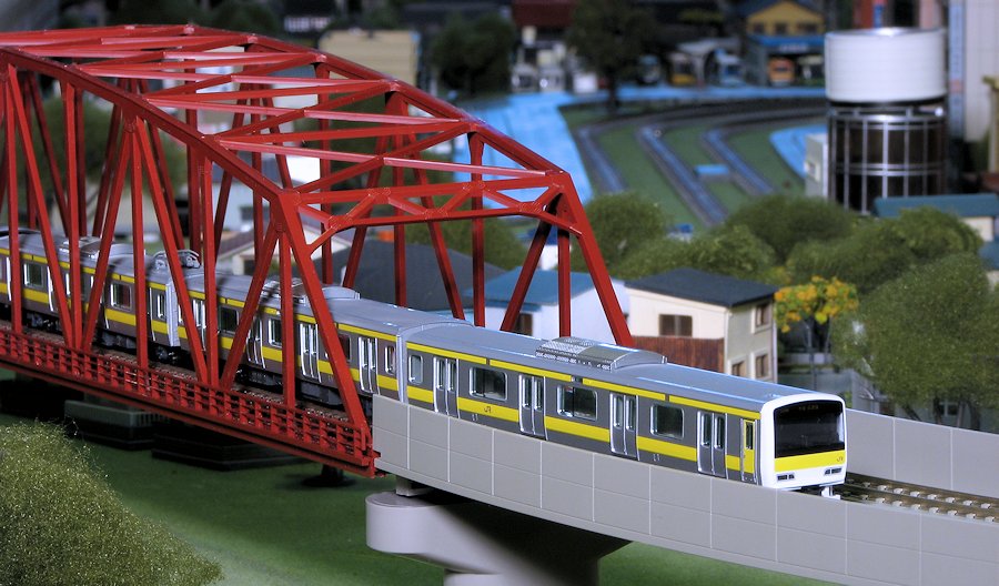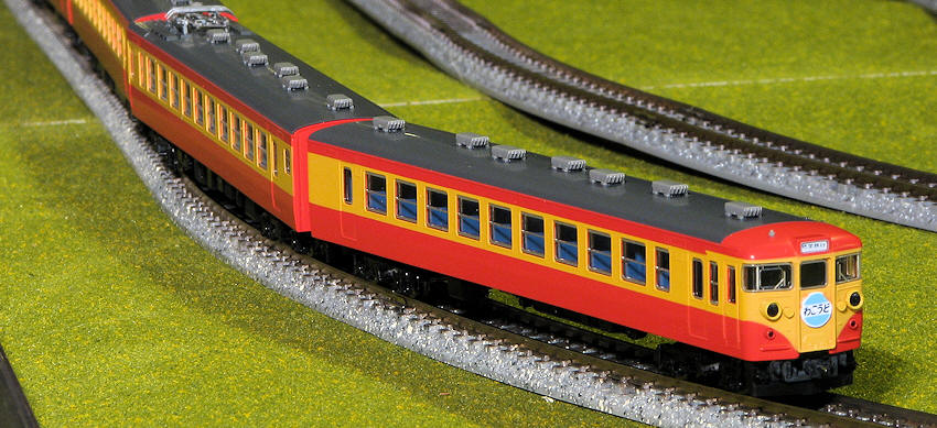 The yellow trimmed train is a Series E231-500 set for the Chuo-Sobu Line from Tomix. This is a ten car train and is pretty much the same as the Yamanote Line set I bought that is made by Kato. The biggest benefit of Kato trains is that all the small car numbers are already printed in place. Tomix offers a sticker sheet where you cut these out and place them on the cars. As of yet, I've not done this to any Tomix trains. The benefit is that you are not limited to one car set, but could theoretically run several of similar trains from the same line, each car set with different numbers. I'm sure that enthusiasts in Japan find this to be a major plus. Of the few people I know who are into trains around here, few are into N gauge and none are into Japanese passenger trains!