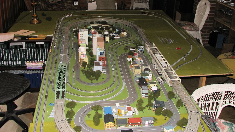 One of the biggest changes is that I was able to make enough room to expand the track. Not what I'd like, but again, room plays an part in things and I'd like no part of the board to be more than 3 or 4 feet from the edge or I'd not be able to reach stuff. What I did was to take a 4x8 sheet of plywood and cut it into an L that is two feet wide. This went on one end and the the remaining 2x6 foot section went down one side. I was somewhat limited as all the wiring was on one side and I did not want to cover that up with plywood. It means that I really cannot add another line, but it provided the opportunity to spread things out to where most areas are not so close any more, though there are still a few bottlenecks. I do plan to expand the inner loops out into the new area and even have the very inner section peek out past the overhead section. The overhead section will take a small turn into the area where the lamp is located in the image, but all that is in the future.