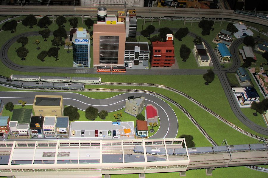 Back at the track, I figured how to add a fifth line. This required slightly shortening the width of the tram track to make room for the additional rails. Most of this runs inside the elevated track area. I also added another quad points switch to enable trains to go from what was now the inner to the outer line. This fifth line is the shortest of the whole batch so will probably not get really long trains. One thing I discovered is that the quad points are basically 'dead' in the middle and while not an issue if you only have one on a line, if you have two of them attached, a jumper will be needed in between the two legs. You can see this in the middle of the image of the two points sets. I'm sure the instructions mentioned this, but not reading Japanese, I did not pick up on that. Eventually, the additional track and jumpers I ordered arrived and I was able to get it all running. I also added a few more buildings to help fill things out.