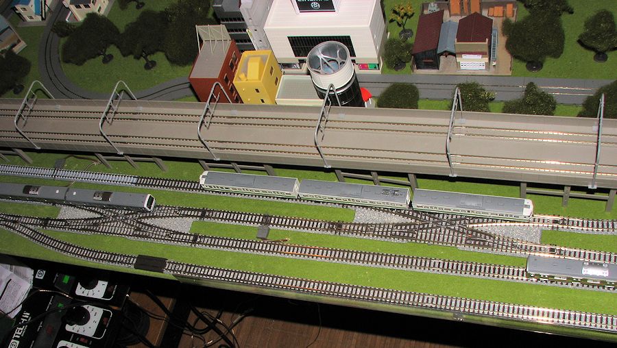 Adding this extra line required one of the switches to be relocated, so that was done, and with the extra track, I was able to have two sidings long enough to hold even the 10 or 11 car trains. Though you'd think things were about full, I'm always trying to come up with other routes. Most of them involve curves so sharp that I doubt the trains would be able to negotiate them. However, one nice thing about Tomix track is that they have curves that go from 604mm radius down to 130mm radius. It is the lower numbers that make up many of the tram curves. In reality, of course, the only way I see to expand things is to do some major shuffling of the space I have in my basement and then go ahead and add a big section. Maybe some day, but I just don't see it happening now. I could put the layout in the attic, but that is far too hot in the summer and too cold in winter. And the saga continues.