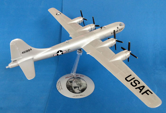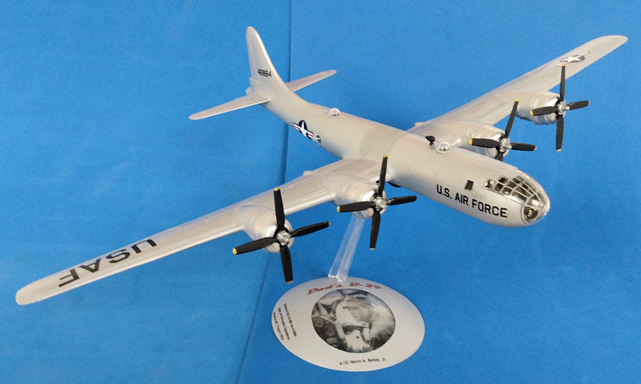 Atlantis Models reissued this kit a few years ago with a larger, more substantial clear base and nicely printed decals that I didn't use. Someone at Atlantis must have noticed that it's actually 1/120 scale, as opposed to the 1/133 scale listed on Scalemates for the Revell kit. Where that scale comes from, I don't know, because I doubt that Revell ever stated the scale on the box. Anyhow, the real thing is 99 feet long with a 141 foot wingspan (the B-29 is the only aircraft whose dimensions I have memorized), so it was easy for me to verify the scale of 1/120.