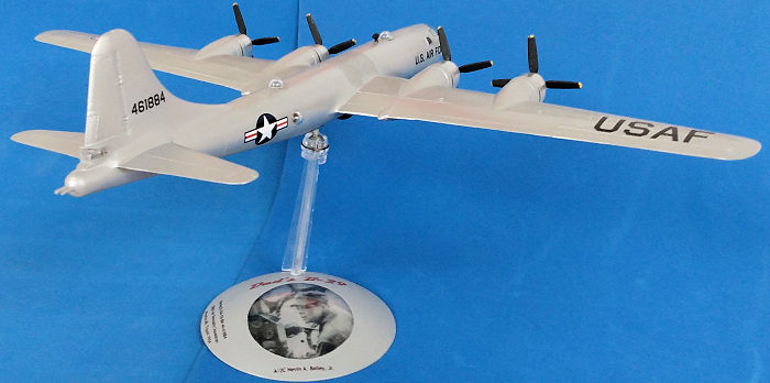 The kit comes with two bases, the original and Atlantis' clear base with a ball and socket joint. Both fit the slot in the bottom of the fuselage, but the clear base is more substantial as well as posable. I sanded out the raised globe detail on the inside of the base and polished the inner surface smooth and glossy. I scanned a photo of my dad sitting in a B-29 cockpit from the Wheelus AB yearbook and laser printed it on clear decal film, then applied the decal to a disc cut from a sheet of clear styrene. This I cemented to the inside of the base. I masked off this circular area on the outside of the base and airbrushed it with a metallic grey I mixed up, then applied the other decals I printed identifying the base, unit, aircraft, and airman.
