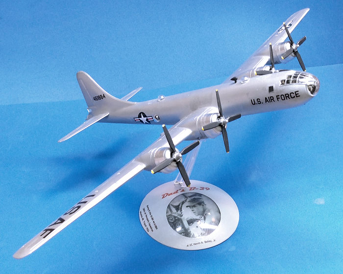 This February, my local IPMS chapter (Delaware Valley Scale Modelers) had a random swap of Atlantis kits, with the requirements that we complete the kits we received in time for the April meeting, and stick to an Out-of-the-Box build. But the instant I got the B-29 kit, the idea popped into my head fully formed of building my dad's B-29, so the build was not going to be quite OOB. The plan still had to be simple, so it was limited to removal of turrets, adding a radome, and decals to represent my dad's B-29.