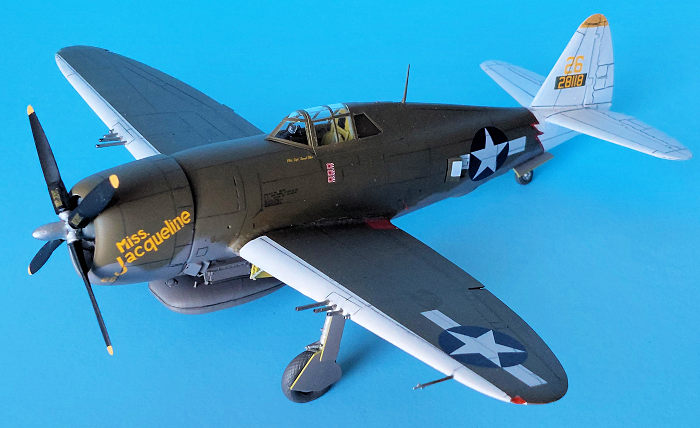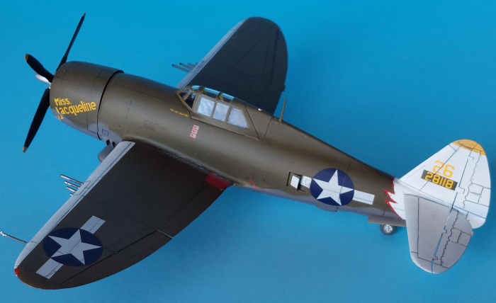 As I wanted to do a Pacific bird with an Australian-built Brisbane fuel tank, I set my sights on Neel Kearby’s “Fiery Ginger” but found so much conflicting in information about Kearby’s various planes that I decide to do another airframe. I eventually chose serial number 42-8118, “Miss Jacqueline” flown by Captain Samuel Blair of the 431st Fighter Squadron while it was based at Durand, New Guinea in August of 1943.