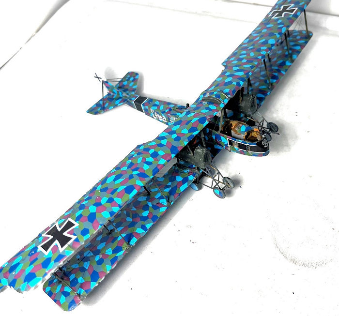 Wings are in three parts. Step 10 is a cutting guide. It shows cutting off a little corner on upper wing, easily done with a sprue cutter. Then they want you to taper the inner edge of both wings to 1.5mm at the trailing edge to provide 3 degrees 10 minutes sweepback. Not having the necessary precision milling machine required, I clamped wings together and gave ‘em a whack with a coarse emory board. These are very long thin wings, and I was concerned about the strength of the butt joined sections. I cut some suitable gussets from thin plastic sheet and glued along the underside joint to add some strength. When covered with lozenge they are near invisible. The instructions have you glue the wings together with 3 degrees 30 minutes dihedral. Not having my slide rule anymore, I stacked a couple nickels under the tips and weighted the center. The wings were then lozenged with no problems, do the lowers before attaching. The wings have some small holes marking strut location. After decaling, these holes have to be located and cleared of decal with a drill bit. You should also enlarge these holes a little to aid strut attachment. If you are an expert modeler, unlike me, you would consider drilling holes for rigging at this point. I didn’t worry about it. Then the wing cross decals were applied. Luckily there are extra crosses, you will probably need them. I did.
