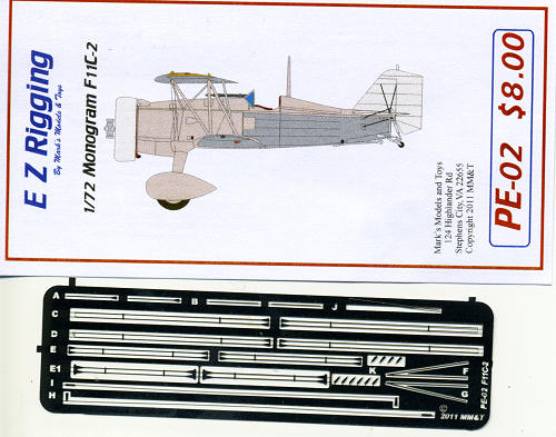 Now, EZ Rigging, from the people at Starfighter Decals, has come on the scene with ready to go photo etch rigging. In this case it is for the Monogram F11C-2. The argument is made that since rigging was more flat than round (you know, airfoil shaped), that photo etch would be the perfect medium for rigging. After all, Tamiya's Swordfish rigging and the rigging for the Accurate Miniatures F2F series were both photo etch and widely acclaimed.
