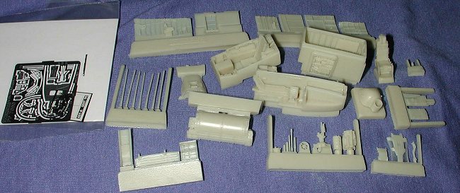 For resin you have new gear and access doors, a new nose, a full gun bay and nose gear well. Those little resin 'sticks' that you see are actually the individual gun barrels. A new cockpit with sidewalls, seat, control stick and instrument panel/glare shield. In etched metal is the instrument panel itself, rudder pedals, and bits for the seat. in addition, there are various canopy items like braces, and mirrors. As I said, a most comprehensive detail set.