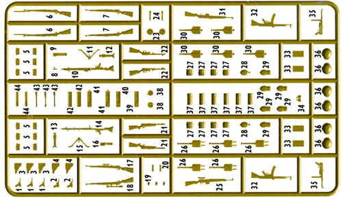 This is a very nice accessory set that includes multiples of various German Infantry weapons used during WWII. It also includes some other bits such as binoculars, helmets, grenades, water bottles, trench shovels ammo boxes, and holsters.