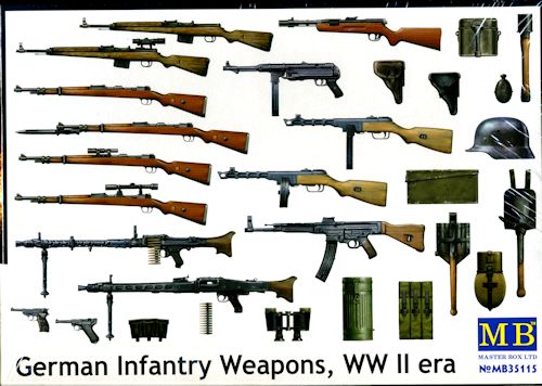 P-08 Luger, Walther P38, Mauser 98K with several versions of scope and without the scopes. G43s with and with out scope, Stgw 44, MP 38, MP 717, Bergman MP 34/1, MP 41, and MG 34 and MG 42s. The assault guns and machine guns have separate bits like magazines, bipods and breech covers.