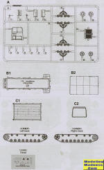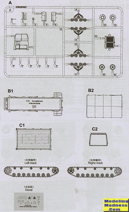 One begins the build by attaching the rest of the suspension/road wheels, idler gear and sprocket to the track piece. Track mounting pieces are then glued to the hull and the track attached. This is followed by the interior and the cab which is then attached to the hull. The front piece, bed and the top are then glued in place and that's it. As I said, it is a simple kit. Though two markings options are shown, there is really only one scheme, which is Russian green for the vehicle with khaki for the top, and of course, the different shades of rust and steel for the tracks. Decals can be used as you wish and are only shown for one option.