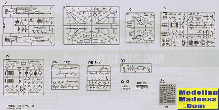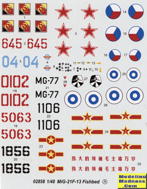 Instructions are nicely drawn with large illustrations. Color info during the build are with Gunze paint numbers. For the overall painting guide several other paint references are provided. Six markings options are provided. Five of them are in overall natural metal and those are for aircraft from USSR, China, North Vietnam, Czechoslovakia, and Finland. An East German option is in green/brown over light blue. The large decal sheet is well done and should work just fine. If that isn't enough for you, there are aftermarket sheets available for this kit.